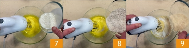Cuando estén bien mezclados añadid el yogur 7, la harina integral ya tamizada 8 y la de almendras 9.