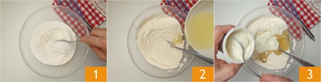 Para preparar la tarta de yogur sin huevos, en un bol verted la harina, la levadura y el azúcar 1 y mezclad con un tenedor. Añadid el aceite de semillas de girasol 2 y el yogur de limón 3.