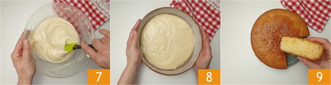 La masa, una vez trabajada, deberá parecer una crema aterciopelada 7. Engrasad y enharinad un molde desmontable de 22 cm. Verted y nivelad la masa 8. Hornead en horno caliente con ventilador a 180° durante 35 minutos, haciendo la prueba del palillo para verificar la cocción. Si sale seco, el dulce está listo. Dejad enfriar completamente antes de desmoldar y cortar 9.