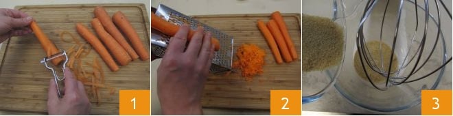 Para realizar la tarta de zanahoria al estilo inglés, empezad a preparar las zanahorias: peladlas 1 y ralladlas finamente 2, debéis obtener 330 g. Luego verted el azúcar moreno dentro del bol del robot de cocina con varillas 3,