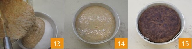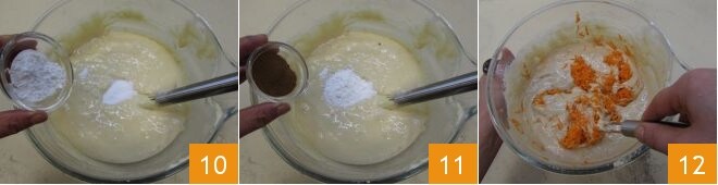 la levadura 10, la canela en polvo 11 y mezclad suavemente para integrar los polvos. Añadid también las zanahorias e incorporadlas a la masa 12.
