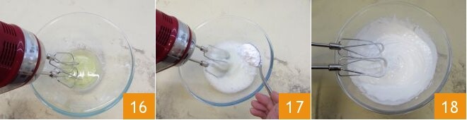 Solo cuando el pastel esté completamente frío, preparaos para hacer el glaseado. Comenzad montando las claras 16 (con las yemas sobrantes podríais preparar una deliciosa crema pastelera) y añadid el azúcar glas poco a poco 17, hasta obtener un glaseado liso y sin grumos 18.