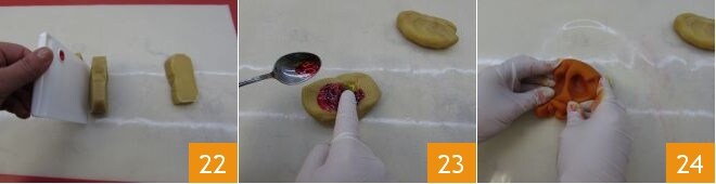 Mientras el glaseado se seca, preparaos para hacer las zanahorias de pasta de azúcar. Dividid el mazapán en 2 partes 22, una de 50 g y otra de 20 g. Tomad la parte más grande y coloreadla añadiendo una gota de color amarillo y una de color rojo 23. Amasando con las manos (para no mancharos utilizad guantes) obtendréis un bonito color naranja vivo 24.