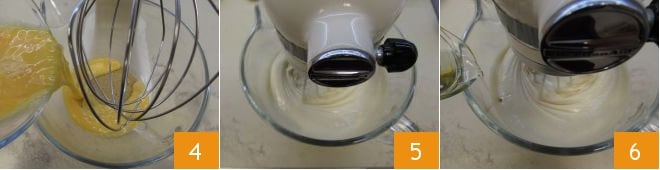 añadid también los huevos 4 y poned la máquina en marcha, durante al menos 10 minutos, hasta que obtengáis una mezcla espumosa 5. Siempre con las varillas en marcha, añadid también el aceite en hilo 6.