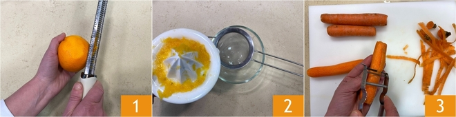 Para preparar la tarta de zanahoria, primero ralla la cáscara de la naranja 1 y resérvala. Exprímela y filtra el jugo 2. En este punto, corta los extremos de las zanahorias y pélalas 3.