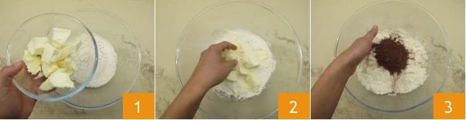 Para preparar la tarta del abuelo, lo primero que hay que hacer es la masa quebrada de cacao. En un bol, verted la harina, añadid la mantequilla fría cortada en cubos 1 y comenzad a trabajar la mezcla con los dedos 2. Cuando tengáis una mezcla arenosa, añadid también el cacao 3 y mezcladlo con el resto de los ingredientes.