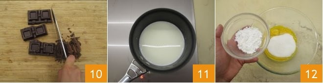 Mientras tanto, picad el chocolate negro 10 que servirá para preparar la crema pastelera. Calentad la leche en un cazo 11 y poned en otro bol las yemas (usad los gramos indicados), junto con el azúcar y la maicena 12.