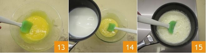 Mezclad todo rápidamente con una espátula o un batidor de varillas 13 y en cuanto la leche esté a punto de hervir, vertedla lentamente en la mezcla de yemas, mezclando para templarlo 14. Luego, trasladad todo nuevamente al cazo 15.