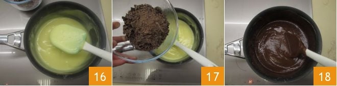 Continuad mezclando para cocinar la crema hasta que se haya espesado 16, luego apagad el fuego y añadid el chocolate 17. Mezclad hasta que se derrita completamente 18,