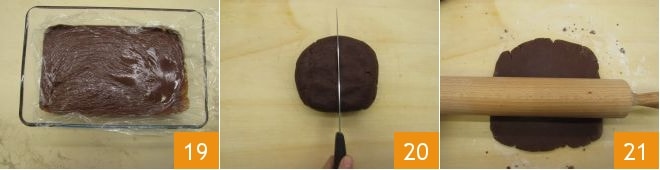 luego trasladadlo a un bol y cubridlo con film transparente en contacto 19. Mantened la crema aparte y tan pronto como hayan pasado los 30 minutos, retirad la masa quebrada. Quitad el film y dividid el bloque por la mitad 21. Luego, extendid la primera mitad, ayudándoos con muy poca harina; trabajad con el rodillo hasta obtener un grosor de unos 3 mm.