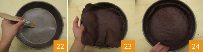 En este punto, engrasad un molde de 24 cm de diámetro 22, luego trasladad la masa quebrada recién extendida dentro del molde 23. Presionad suavemente con los dedos para adherir la masa al molde 24, asegurándoos de obtener un borde lo suficientemente alto para contener la crema. Si es necesario, eliminad el exceso de masa.
