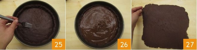 Pinchad la base con un tenedor 25 y verted la crema en el interior, nivelándola con el dorso de una cuchara 26. Luego, extendid la segunda parte de la masa quebrada para obtener un grosor de 3 mm 27.
