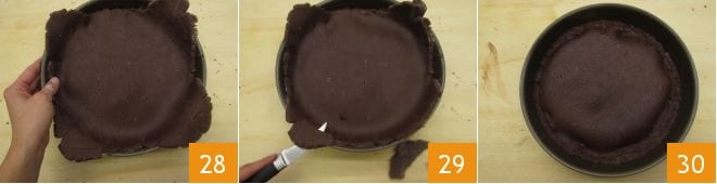 Colocad la masa quebrada sobre la crema y presionad suavemente en el borde 28 para que se adhiera a la inferior. Usando un cuchillo pequeño, eliminad el exceso de masa (29-30).