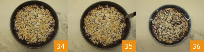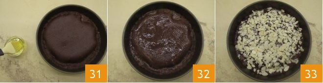 En este punto, batid ligeramente la clara y utilizadla para pintar toda la superficie de la tarta (31-32), que luego debéis cubrir con las almendras laminadas 33. Hornead en horno estático precalentado a 180° durante unos 40 minutos.