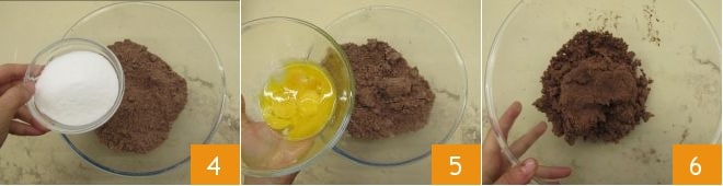 Luego, añadid el azúcar 4 y mezclad nuevamente. Por último, añadir también las dos yemas (guardad las claras) y el huevo entero (respetad los gramos indicados) 5 y continuad trabajando todo con las yemas de los dedos hasta obtener una mezcla homogénea 6.
