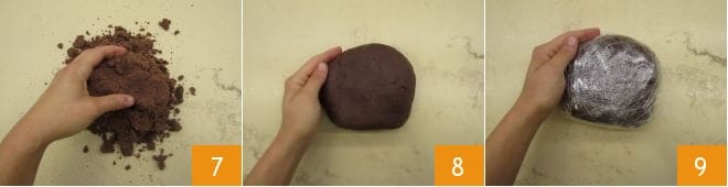 En este punto, trasladadla a una superficie 7 y trabajadla rápidamente hasta compactarla 8. Luego, envolvedla en film transparente 9 y guardadla en el frigorífico para que se endurezca durante al menos 30 minutos.