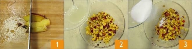 Para realizar la tarta golosa de melocotones, primero lavad los melocotones para el relleno y cortadlos en cubitos 1. Trasladad los melocotones a un bol, añadid el zumo de limón 2 y el azúcar 3.