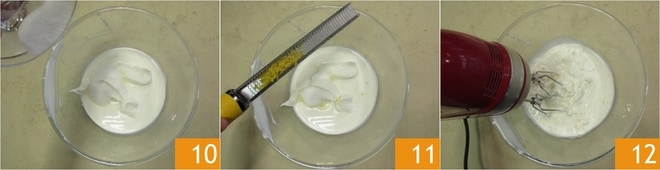 Mientras tanto, preparad la crema: en un bol, mezclad el mascarpone y la nata fríos de la nevera, luego añadid el azúcar 10 y la ralladura de limón 11 y batid con las varillas eléctricas 12.