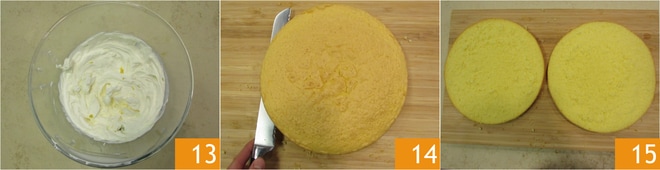 La consistencia deberá ser firme, pero no demasiado montada 13; trasladad la crema a una manga pastelera sin boquilla. Cuando la tarta se haya enfriado completamente, cortadla por la mitad en sentido horizontal usando un cuchillo de sierra 14 para obtener dos discos 15.