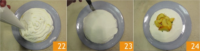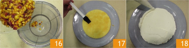 En este punto, escurrid los melocotones recogiendo el líquido de maceración en un bol que os servirá para empapar la tarta 16. Pincelad el primer disco por el lado cortado 17 y esparcid una capa de crema, alisándola con una espátula. Luego formad un borde a lo largo del borde, para que los melocotones no se deslicen fuera 18.