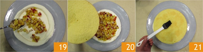 Distribuid uniformemente los melocotones en cubitos 19 y cubrid con el segundo disco de tarta con la parte cortada hacia arriba 20. Pincelad la superficie con el jugo de los melocotones 21.
