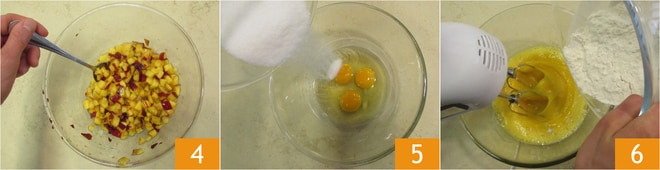 Mezclad bien y dejad reposar durante 30 minutos, de esta forma soltarán un poco de su jugo 4. Pasad a la preparación de la masa: verted los huevos y el azúcar en un bol 5 y batidlos con las varillas eléctricas durante unos 3 minutos, luego agregad la harina 6.