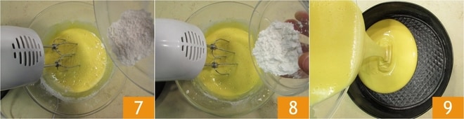 Cuando la harina esté completamente absorbida, añadid también la fécula 7 y la levadura, una a una 8. Continuad trabajando con las varillas hasta obtener una mezcla lisa y homogénea. Verted la masa en un molde de 22 cm de diámetro que habréis previamente engrasado y enharinado 9. Coced en horno estático precalentado a 180° durante 15-17 minutos. Antes de sacar del horno, verificad la cocción con un palillo y dejad enfriar completamente en el molde.