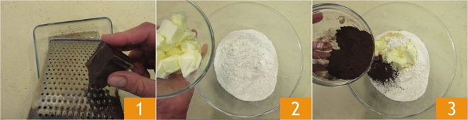 Para preparar la tarta desmenuzada de chocolate y naranja, primero ralla el chocolate negro con un rallador de malla fina 1 y prepara la masa: coloca en un bol la harina, la mantequilla fría en cubos 2 y el cacao amargo 3.