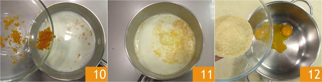 Pasa a la crema: vierte en un cazo la leche y la cáscara de naranja 10 y lleva a un ligero hervor 11. Mientras tanto, mezcla las yemas y el azúcar moreno en otro cazo utilizando una espátula, de manera que incorpores la menor cantidad de aire posible 12.