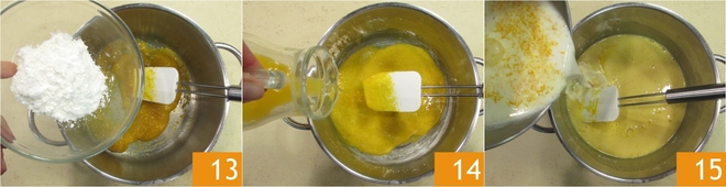 Añade la maicena 13 y mezcla para que se absorba por completo, luego agrega el jugo de naranja 14 y mezcla de nuevo. Cuando la leche esté caliente, viértela sobre la mezcla de huevos, poco a poco, mientras sigues mezclando 15.