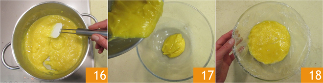 Lleva la mezcla al fuego y cocina durante unos 5 minutos, mezclando de vez en cuando 16. Cuando obtengas una crema suave y densa, transfiérela a un bol 17 y cubre con film plástico en contacto 18. Deja enfriar y coloca en el frigorífico durante aproximadamente una hora.