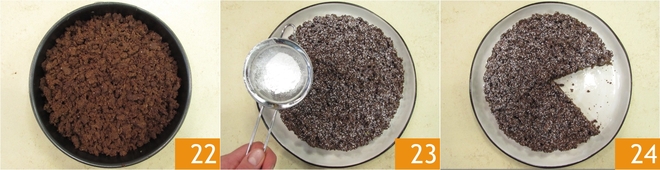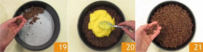 Pasado este tiempo, estás listo para montar la tarta: forra un molde de 20 cm de diámetro con papel de horno y distribuye la mitad de la masa hasta cubrir toda la base 19. Vierte la crema de naranja y nivélala con el dorso de una cuchara, dejando un par de cm desde el borde 20, luego desmenuza la masa restante hasta cubrir toda la superficie 21.