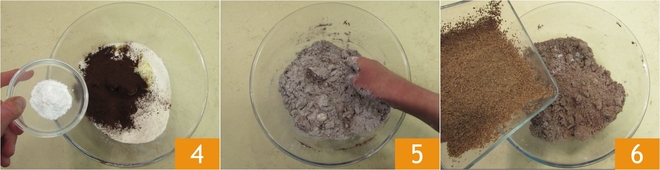 Añade la levadura 4 y amasa con la punta de los dedos para obtener una mezcla arenosa 5. En este punto, agrega el chocolate rallado 6.