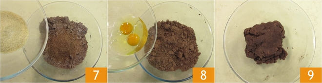Añade también el azúcar moreno 7 y trabaja con las manos para mezclar los ingredientes. Finalmente, agrega los huevos 8 y amasa hasta obtener una mezcla homogénea y desmenuzada 9. Envuelve la masa en film plástico y colócala en el frigorífico hasta el momento de su uso.