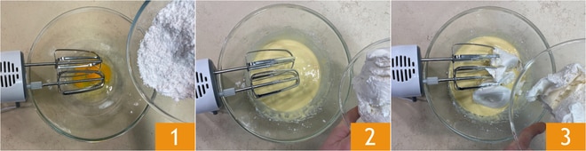 Para preparar la naked cake con panettone, empezad con la crema: en un bol poned los huevos y el azúcar glas 1, luego mezclad los ingredientes con las varillas eléctricas. A continuación, añadid la ricotta 2 y el mascarpone 3.