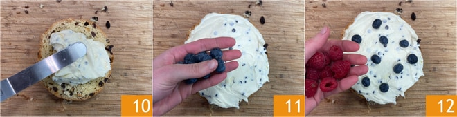 Rellenad la primera rebanada con la crema 10, añadiendo algunos arándanos 11 y frambuesas 12. Cubrid con la segunda rebanada y continuad de esta manera hasta recomponer el panettone.