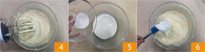 Continuad batiendo hasta obtener una crema espumosa y homogénea 4. En otro bol, verted la nata, añadid el estabilizante 5 y montad. Incorporad la nata montada a la mezcla de ricotta y mascarpone 6 mezclando de abajo hacia arriba para no desmontarla.