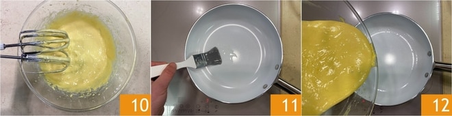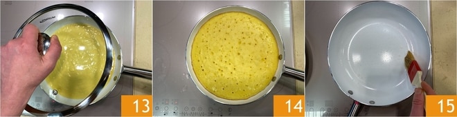 Una vez que la harina y la levadura estén bien amalgamadas, apagad las varillas 10. Ahora untad con aceite vegetal una sartén de 20 cm en la base y 24 cm en la superficie y calentadla a fuego bajo; si utilizáis placas de inducción, ajustadla a 3. Si utilizáis la cocina a gas, seguid las indicaciones de cocción indicadas en el consejo. Aseguraos de que la sartén esté bien aceitada en toda la superficie, luego verted la mezcla en su interior 12.