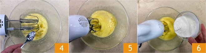 Añadid una pizca de sal 4 y mezclad con las varillas 5. Agregad luego el yogur 6 y mezclad nuevamente hasta que esté bien incorporado.