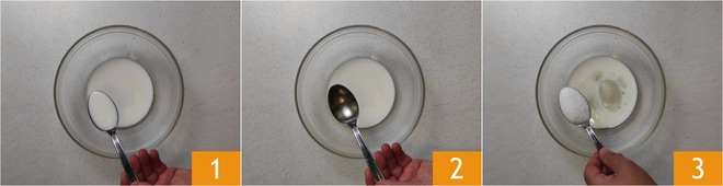 Para preparar la tarta en taza sin huevos en un bol verted la leche 1, el aceite 2 y el azúcar 3.