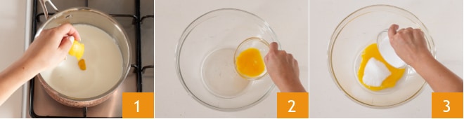 Para realizar la tarta espiral, comenzad con la preparación de la crema: calentad la leche en una cacerola con la cáscara de limón 1. Mientras tanto, en un bol verted las yemas 2 y el azúcar 3.