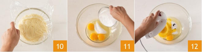 Luego, transferid la crema a un bol, cubrid con film transparente 10 y dejadla enfriar, primero a temperatura ambiente y luego en la nevera. Ahora preparad la tarta: en un bol grande verted los huevos con el azúcar 11, añadid las semillas de la vaina de vainilla y batid con las varillas eléctricas 12 hasta que estén inflados y espumosos.