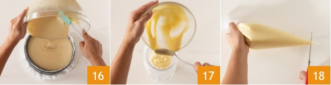 Verted la masa en un molde desmontable de 22 cm, previamente engrasado y enharinado o forrado con papel de horno 16; niveladlo con una espátula si es necesario. En este punto, tomad la crema ya completamente enfriada y recógela en una manga pastelera 17 sin boquilla 18.
