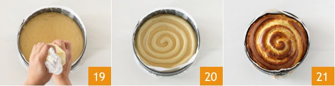 Realizad una espiral sobre la masa 19 comenzando desde el centro de la tarta 20. Coced en el horno a 180°C durante unos 35-40 minutos. Una vez cocida, sacad del horno vuestra tarta espiral y dejadla templar antes de servirla 21!
