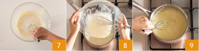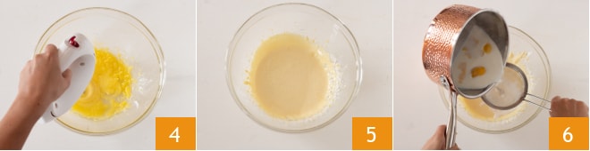 Batid con la batidora eléctrica las yemas con el azúcar 4 hasta que estén infladas y espumosas 5. Agregad la harina tamizada poco a poco, mezclad y luego incorporad la leche caliente en hilo, vertiéndola a través de un colador para retener la cáscara de limón 6.