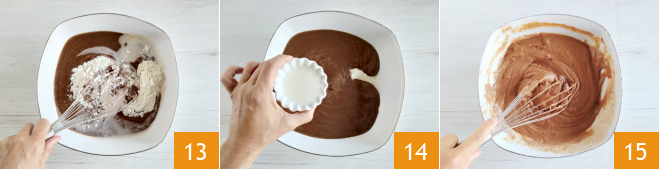 Mezclad con una varilla manual 13 y añadid la leche 14. Mezclad para ablandar un poco la mezcla 15.