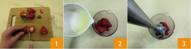 Para preparar la tarta esponjosa de fresas, primero lave las fresas y quíteles el tallo 1. Transfiéralas a un recipiente alto y estrecho, añada el zumo de limón 2, triture con una batidora de mano 3 y reserve.
