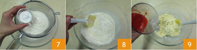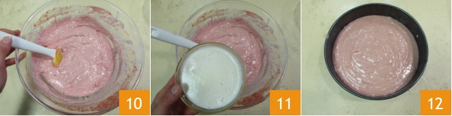 y la levadura 7. Incorpórelos a la masa, mezclando con una espátula de abajo hacia arriba y suavemente también en sentido horario 8. Añada la mitad del puré de fresas 9