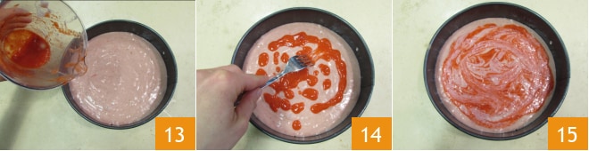 Vierta encima el puré de fresas restante 13 y con un tenedor cree un efecto marmolado 14 15. Hornee en el horno estático precalentado a 180° durante unos 55 minutos.
