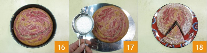 Saque del horno 16, deje que se temple y desmolde. Luego espolvoree con azúcar glas 17 y sirva su tarta esponjosa de fresas 18.